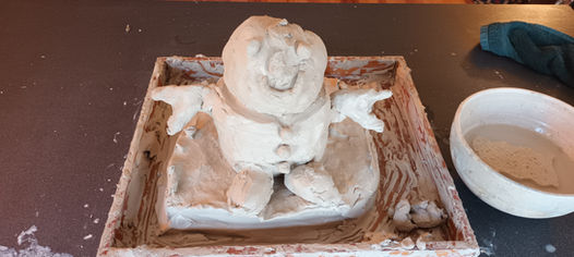 Un cadre rectangulaire en bois, posé sur une table, contenant une vingtaine de kilos d’argile malléable.