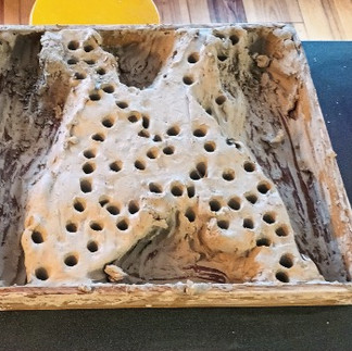 Un cadre en bois muni d'un fond rempli d'une assez grande quantité d'argile souple (environ 20 kilos) et de l'eau contenue dans un bol ; chacun de ces éléments a des qualités sensorielles très différentes et complémentaires.