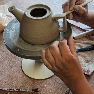Formes ouvertes, formes fermées, les deux mains en contact, la pression juste, tout doucement, tout gentiment ou plus fermement, direction vers le haut, on resserre, on détermine le diamètre, les deux mains vont ensemble, pression intérieure la forme s'ouvre, pression extérieure la forme se resserre, fluidité de l'eau, trop d'eau, la terre qui s'échappe, pas assez d'eau, la terre grippe, ... on recommence, et toujours, la douceur de la terre, son contact, son bien-être.