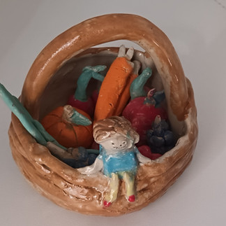 Les enfants ont réalisé un magnifique tableau collectif représentant un jardin potager : la terre, le ciel, des rangées de légumes (poireaux, tomates, brocolis…), des fleurs, des arbres… Ils ont aussi sculptés un bas relief composé de fleurs peintes aux engobes colorées, façonnés aux colombins des paniers en argile remplis de légumes, et peint un arbre avec ses branches, racines et feuillage. Leur créativité débordante a donné naissance à des œuvres vibrantes, où les couleurs ont été à l’honneur.
